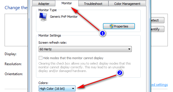 Bước 3: Tại tab Monitor chọn chế độ 16 bit màu.